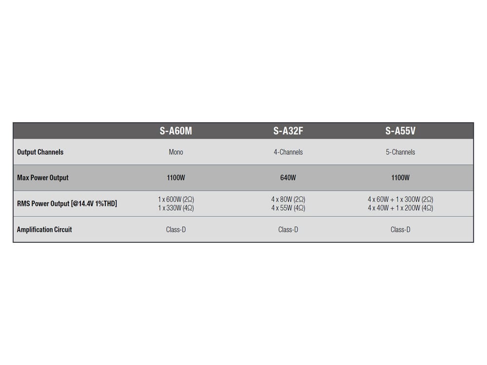 The S-Series amplifiers are available in mono, 4-channel and 5-channel configuration.